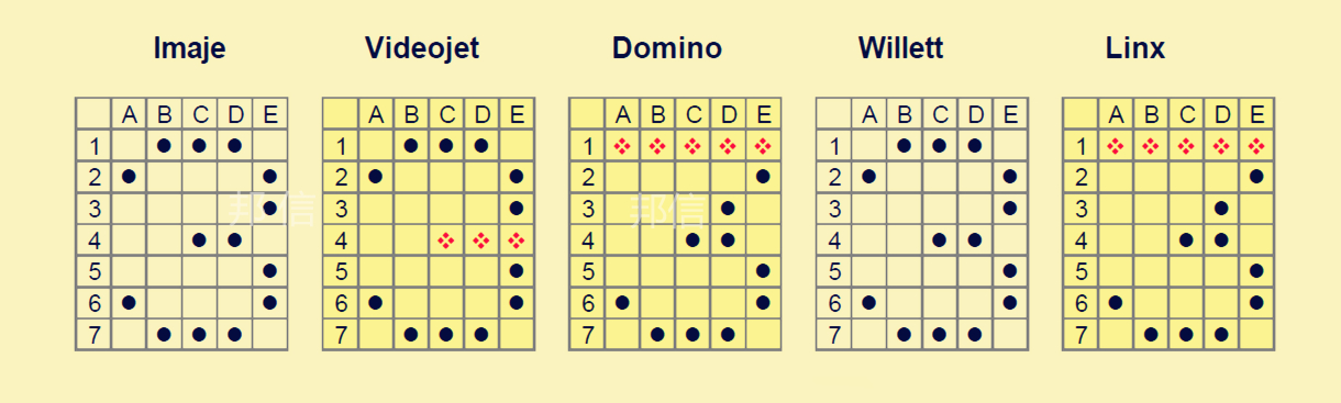 參考圖片可以看到,不同的噴碼機(jī)字體設(shè)計(jì)會(huì)有所不同,同樣的生產(chǎn)日期,打印出來(lái)效果會(huì)不一樣。同樣是7點(diǎn)陣的字體: